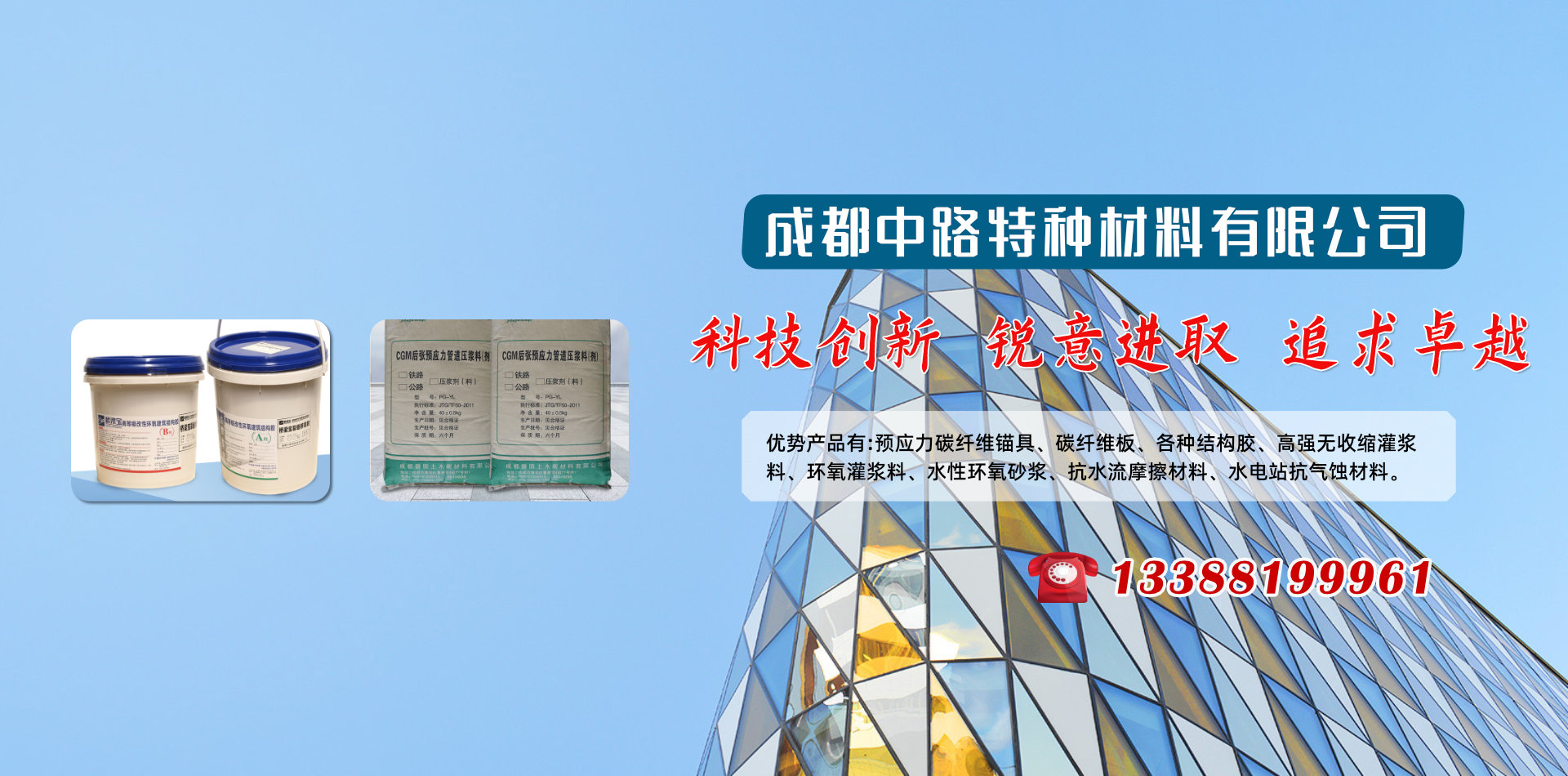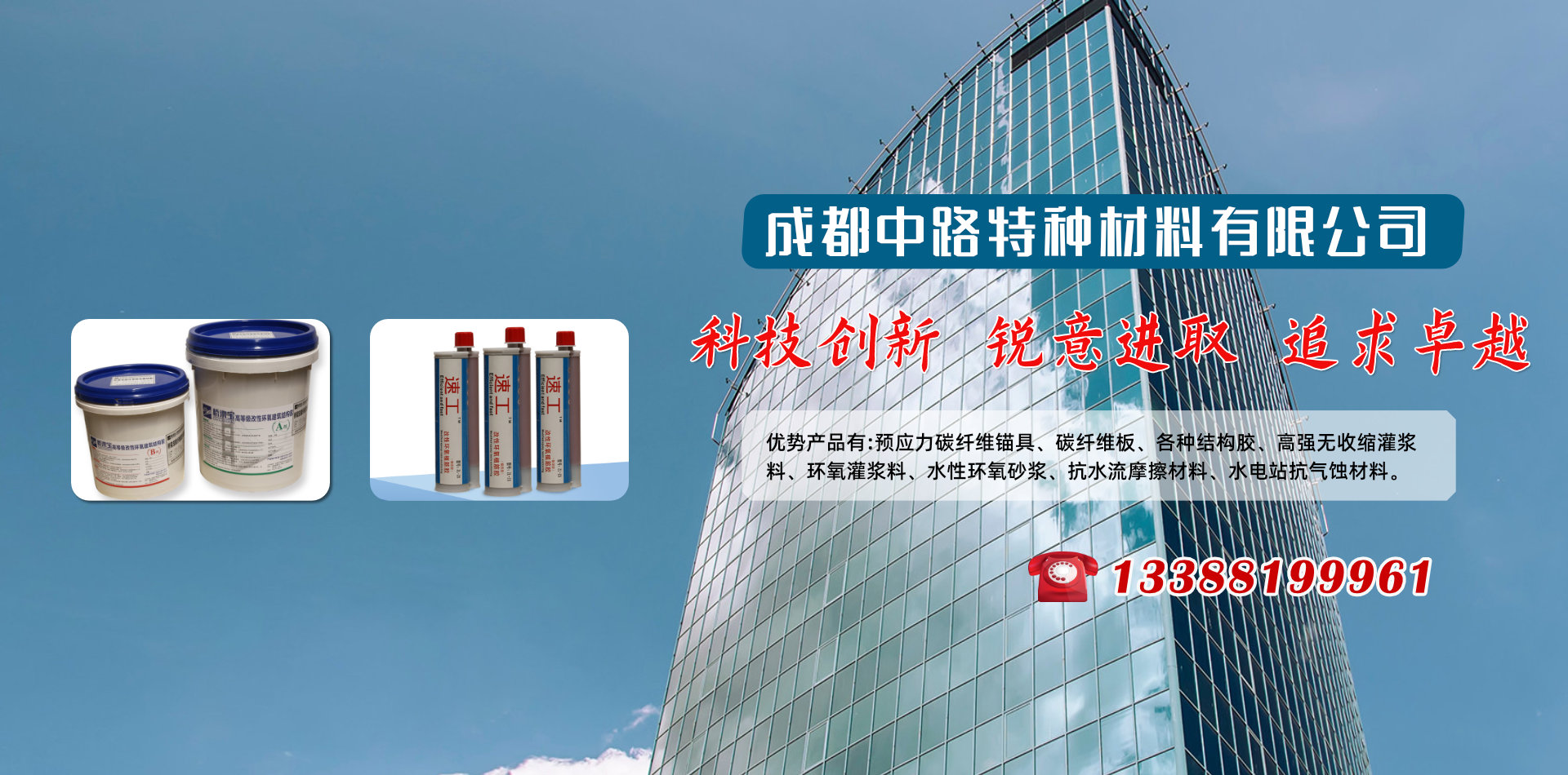 成都中路特種材料有限公司借助清華大學高分子材料學科、晨光化工研究院、西南交通大學、四川交通職業(yè)技術學院科研技術平臺成為一家集新材料研發(fā)、銷售、技術服務和施工于一體的專業(yè)服務公司,優(yōu)勢產(chǎn)品有:預應力碳纖維錨具、碳纖維板、各種結構膠、高強無收縮灌漿料、環(huán)氧灌漿料、水性環(huán)氧砂漿、抗水流摩擦材料、水電站抗氣蝕材料和研發(fā)各種特殊用途膠黏劑產(chǎn)品地處西南腹地成都,業(yè)務覆蓋四川各大中小城市、重慶、云南、昆明、新疆、西藏等區(qū)域。產(chǎn)品涵蓋各種加固施工材料、施工設備及施工配件,品牌有威士邦等aa進口品牌,同時批發(fā)銷售國產(chǎn)高、中、低端品牌,為客戶提供全面參考。